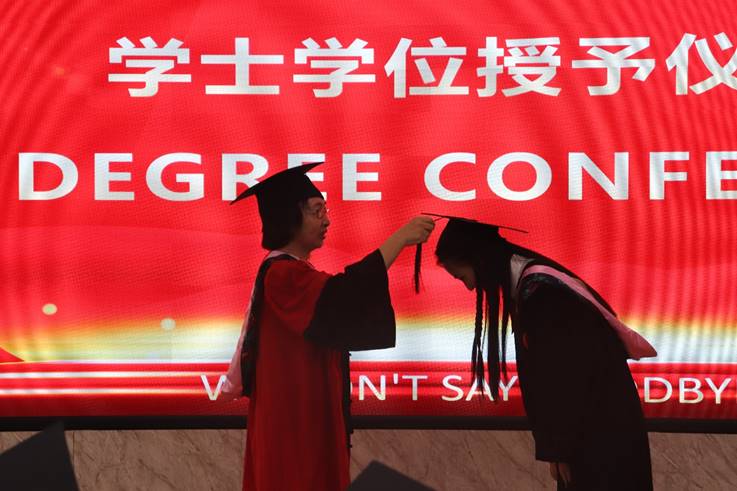 随后,外国语学院副院长黄雪娟宣读2023届本科毕业生学士学位授予文件,院长邢理平为获得学士学位的本科毕业生扶正流苏并颁发学位证书。