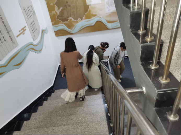 应急广播响起,读者在工作人员指挥下,捂住口鼻,弓身弯腰、扶着楼梯扶手,保持安全距离,有序疏散读者撤离危险区域,整个疏散过程井然有序。