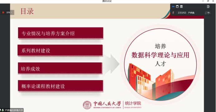 会上,尹建鑫为参会人员分享了其统计与数据科学人才的培养模式与效果。他主要从专业设置与培养方案、系列教材建设、培养成效和《概率论》教材建设四个方面进行分享,结合一流学科和一流专业建设,较详细地阐述了其人才交叉培养(应用经济学+数据科学、数据科学+工商管理)、硕博贯通的统计与数据科学专业情况以及人才培养方案的实施。他还为大家介绍了丰硕的教材建设成就、教学成果及人才培养成效,同时,也指出了目前教材建设中存在的一些问题,结合自身主编的《数据科学概率基础》,阐述了其中的特色做法、与生活实际相结合的概率解释、数据科学中的常用概念、前沿方法选讲以及概率不等式等主要内容。
