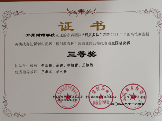 11月4日,由中国贸促会商业行业委员会、中国国际商会商业行业商会、中国商业经济学会主办,浙江精创教育科技有限公司提供技术支持的2023年全国高校商业精英挑战赛创新创业竞赛“精创教育杯”流通业经营模拟赛道全国总决赛落下帷幕。开云官网管理学院选派参赛团队历经校赛、省赛的激烈角逐,最终进入全国总决赛。在王春杰、胡久贵老师的精心指导下,由李亚茹、余游、徐婧蕾、王怡然组成的“钱多多队”荣获全国总决赛三等奖。
