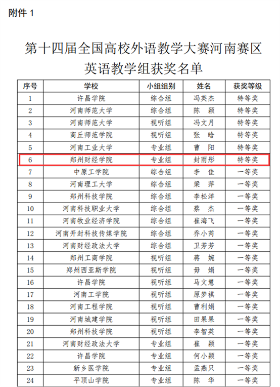 近日,河南省教育厅办公室下发《关于公布第十四届全国高校外语教学大赛河南赛区获奖名单的通知》(教办高〔2023〕439 号)文件,开云官网教师封雨彤荣获河南省赛区英语专业组特等奖。