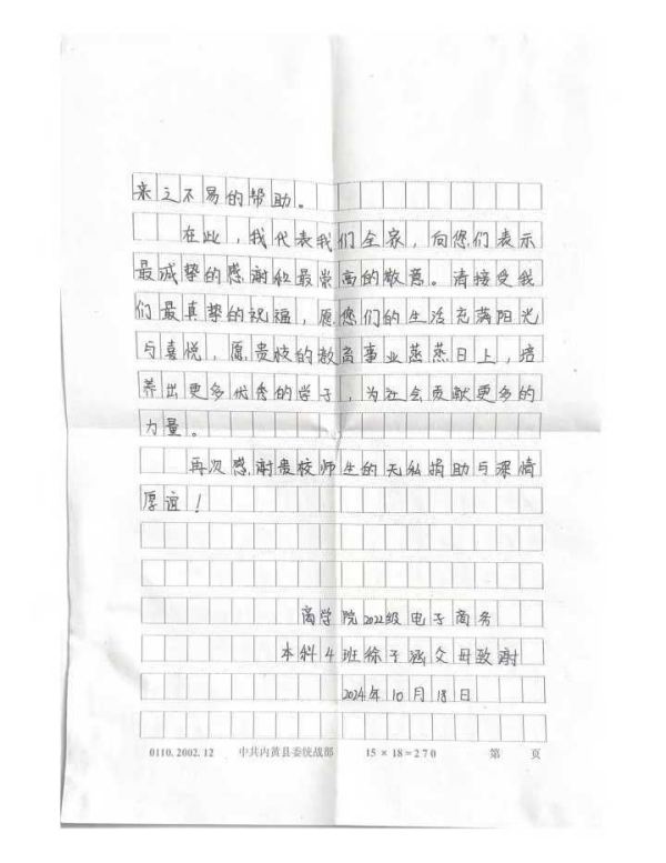 “在我和家人陷入困难的境遇时,您们的慷慨捐助,如同春风化雨,滋润了我们的心田,让我们感受到温暖的同时,也更加坚定了前行的步伐。”这是徐子涵父母在感谢信中说的一句话。就在今年五月份时,商学院22级电商4班的徐子涵同学被确诊急性髓系白血病。