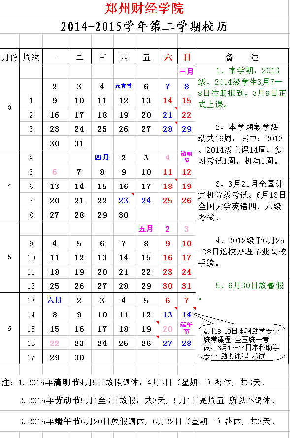 2014-2015学年第二学期校历