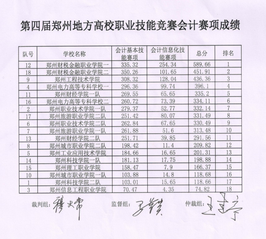 第四届郑州地方高校职业技能竞赛会计技能赛项成绩公示