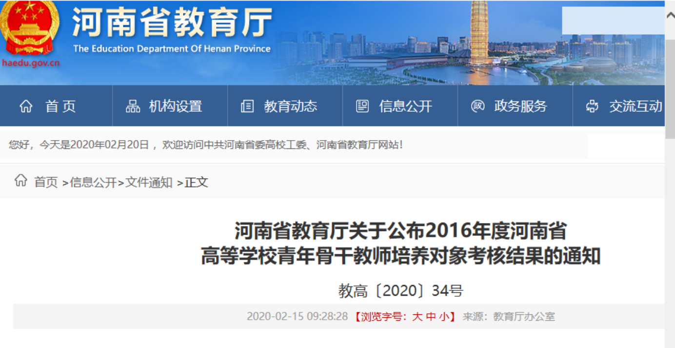 近日,河南省教育厅下发了《关于公布2016年度河南省高等学校青年骨干教师培养对象考核结果的通知》(教高〔2020〕34号),开云官网省级青年骨干教师王艳杰顺利通过考核。