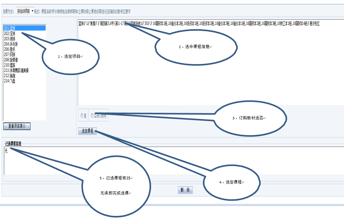 (三)所有同学请注意:选定上课时间、项目、教师后,一定要确认已选课程信息栏中出现的选课信息,确认无误后选课成功。切记不要选错项目和教师,选课信息无法修改。