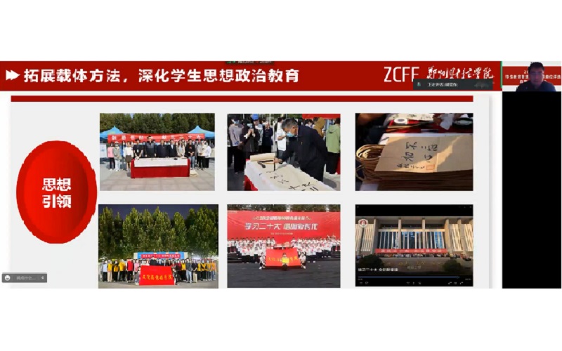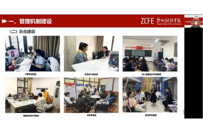 学生处副处长陈方媛宣布2022年度学生教育管理工作先进单位评选自评情况汇报会正式开始。各二级学院汇报人按抽签顺序依次汇报,紧紧围绕学校发展总体目标,按照量化考核标准要求,以社会主义核心价值观为统领,坚持以学生为本,以教师为主导,一切为学生服务的工作理念,坚持以安全稳定为基础,管理服务为手段,改革创新为动力,学风建设为重点,人才培养为目标,充分结合学院实际和学生特点,从学生工作管理方法、思想政治教育、日常行为管理和特色文化活动等多方面汇报了本学院一学年来的学生管理工作成果。通过强化教育、优化服务、深化管理、加强学生的思想政治教育和日常管理,积极探索新时期开展学生工作的新途径、新方法,努力开创学生工作新局面。