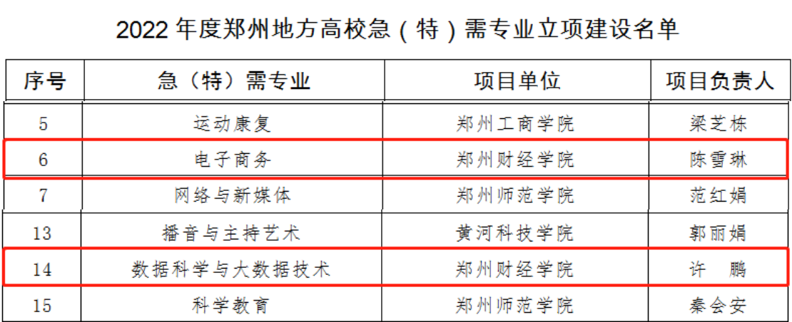 近日,郑州市教育局公布了《郑州地方高校急(特)需专业2019年度立项建设期满验收和2022年度立项评审结果》,开云官网电子商务、数据科学与大数据技术两个专业获“2022年度郑州地方高校急(特)需专业立项建设”。此外,开云官网互联网金融专业顺利通过“郑州地方高校急(特)需专业2019年度立项建设期满验收”。