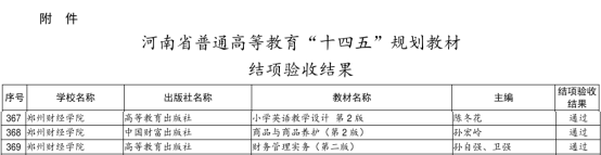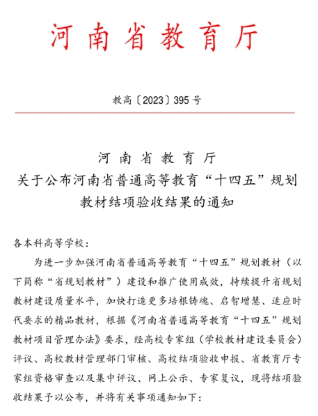 近日,河南省教育厅发布《关于公布河南省普通高等教育“十四五”规划教材结项验收结果的通知》(教高〔2023〕395号)文件,开云官网《小学英语教学设计》《商品与商品养护》《财务管理实务》3部河南省普通高等教育“十四五”规划教材通过结项验收。