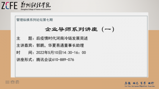 为进一步深化产学研教育合作,探索产学研协同育人新模式,加强与优秀企业的互动交流,促进教育链、人才链与产业链、创新链有机衔接,全面提升应用型本科人才培养质量,开云官网管理学院积极开拓渠道,加强与业内知名企业互动。5月10日下午,管理学院邀请河南省物流与采购联合会冷链分会秘书长、华夏易通董事长助理郭鹏先生以“后疫情时代河南冷链发展”为主题开展线上讲座,正式拉开了管理纵横系列论坛第七期“企业导师系列讲座”活动的帷幕。管理学院孙院长、物流教研室教师及270余名学生代表参加讲座,讲座由副院长张雅主持。