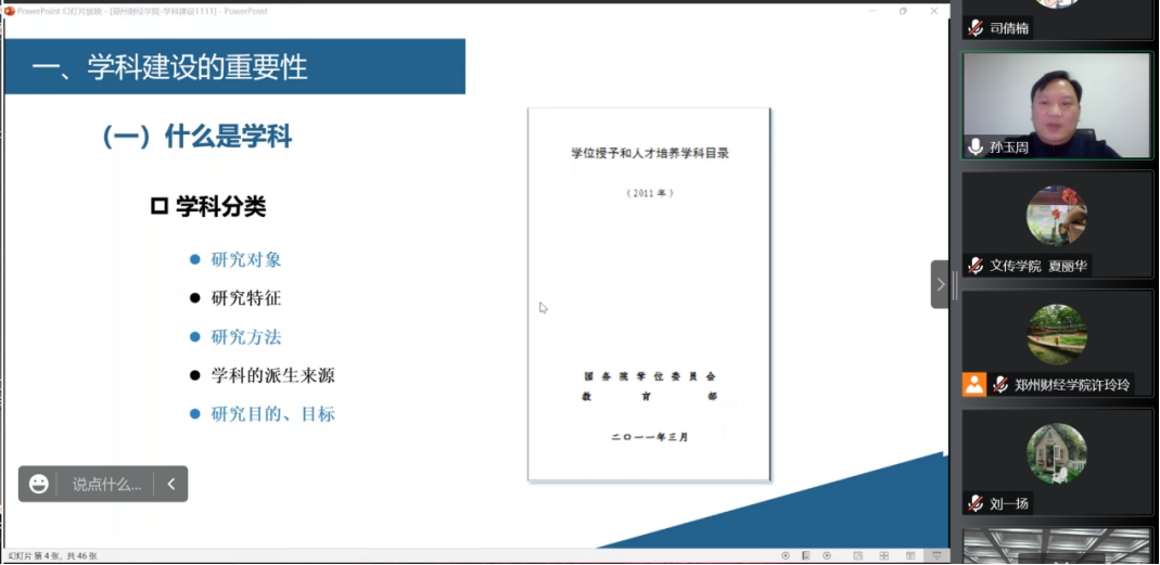 孙玉周教授从学科建设的重要性、研究生教育与学位点建设、学科建设项目和学科建设项目申报四个方面进行了分析。他指出,学科状况从根本上体现学校的办学水平、办学实力、办学特色、学术地位与核心竞争力。学科是学校发展的根基,学科强则大学强,学科弱则大学弱。高等教育未来的建设更看重一流学科、特色学科对大学整体发展的带动作用,更看重学科发展水平和质量。学科建设是高校建设和发展的核心,学科建设规划直接体现大学的定位和战略选择,对高校发展具有极其重要的作用。他强调,总结凝练学科方向非常重要,同时要培养和聘用具有较强实力的学科带头人与学科骨干,注重科学研究中标志性成果的积累,要积极申报河南省重点建设学科,申报过程本身就是总结和提升的过程。