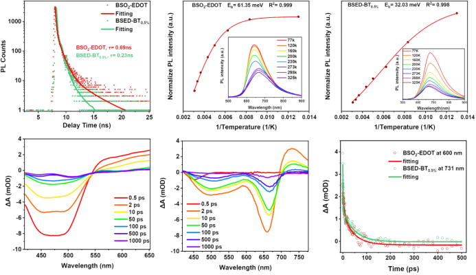 图2:时间分辨荧光、变温荧光、及飞秒瞬态吸收光谱图