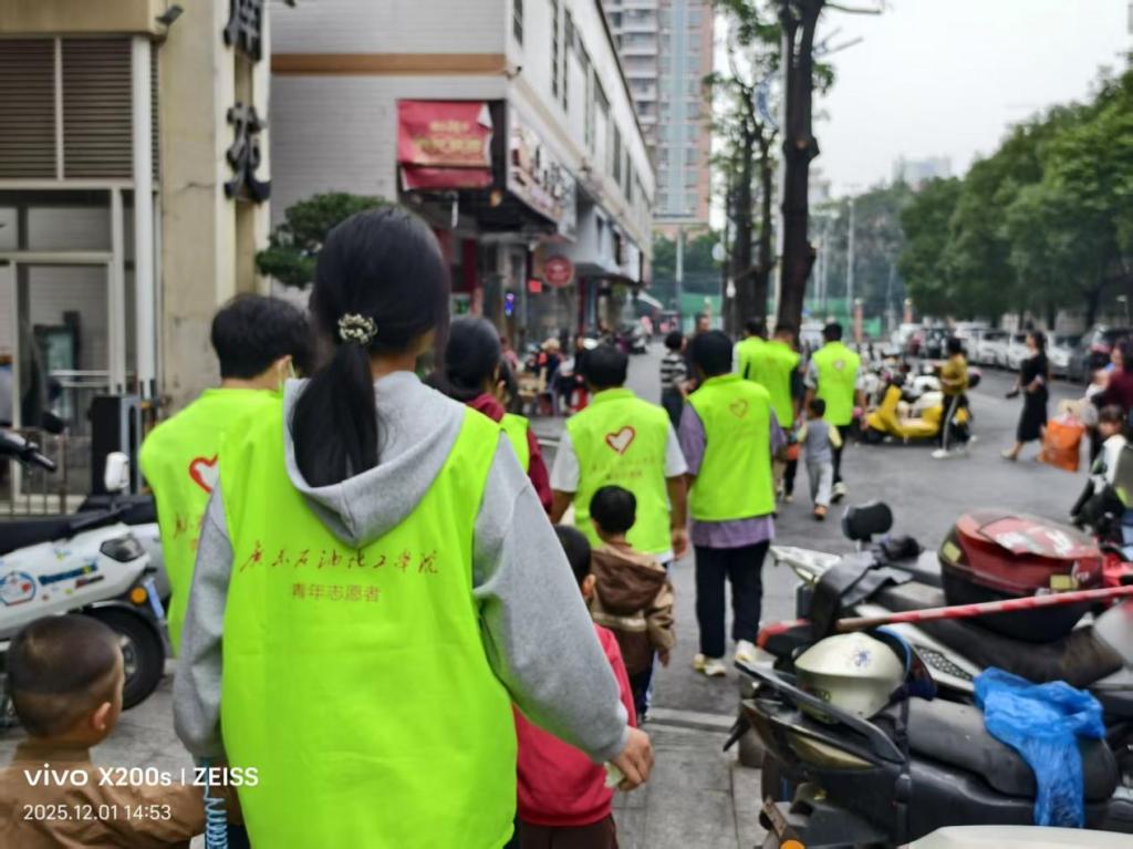 户外活动环节,志愿者们更是细心守护。每当孩子们列队出行,他们便分散在队伍周围,或轻牵小手,或时刻关注,身上统一的亮黄色志愿者马甲在街道上形成了一道移动的“安全守护圈”,确保每位孩子都在视线范围内,保障外出安全。从室内教学到户外行走,志愿者们用持续的陪伴传递着一份静默而坚定的温暖。